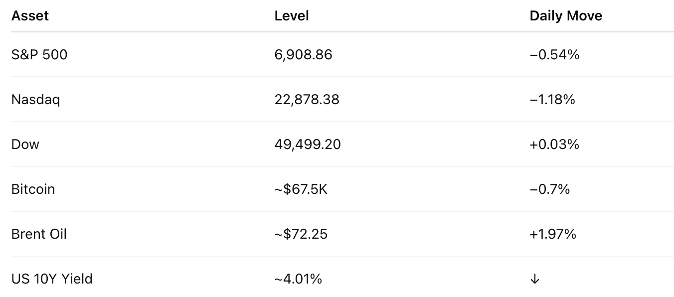 AI stocks stumble. Bonds stir. Bitcoin cools. Markets recalibrate.